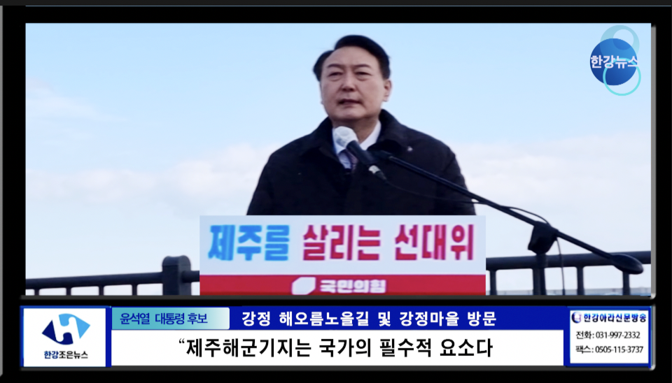 윤석열 대통령 후보는 2022.2.5.(토) 14:30, 강정 해오름 노을길 및 강정마을을 찾아 '세계적 크루즈 관광 허브'와 ‘민군복합형 관광미항 건설'을 약속했다.