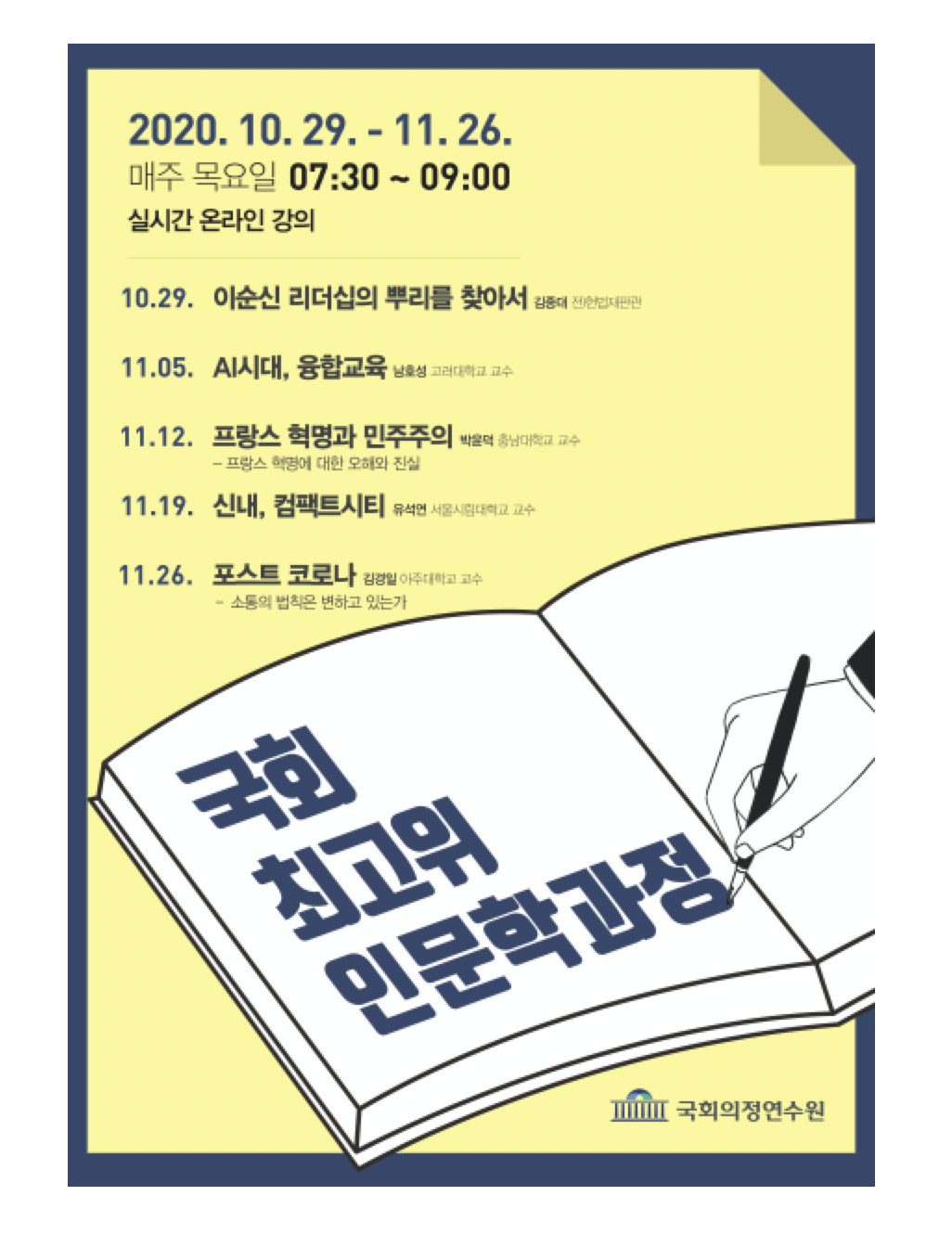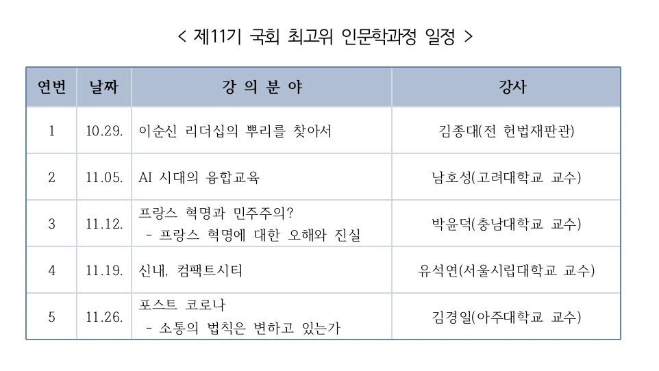 국회사무처(사무총장 김영춘) 의정연수원은 10월 29일(목) 제11기 국회 최고위 인문학과정을 온라인으로 진행한다.