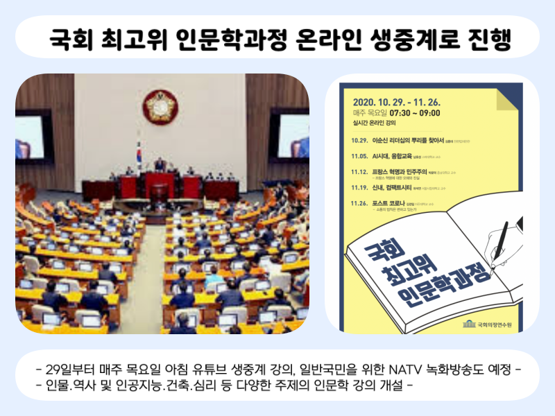 - 29일부터 매주 목요일 아침 유튜브 생중계 강의, 일반국민을 위한 NATV 녹화방송도 예정 - - 인물․역사 및 인공지능․건축․심리 등 다양한 주제의 인문학 강의 개설 - |