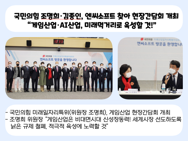 국민의힘 조명희 미래산업일자리특별위원회 위원장은 김종인 비상대책위원장과 27일(화) 엔씨소프트(대표이사 김택진)를 방문해 4차 산업혁명 및 AI발전에 따른 일자리 문제와 함께 게임산업의 현황과 업계 애로사항을 청취하는 현장간담회를 개최했다.