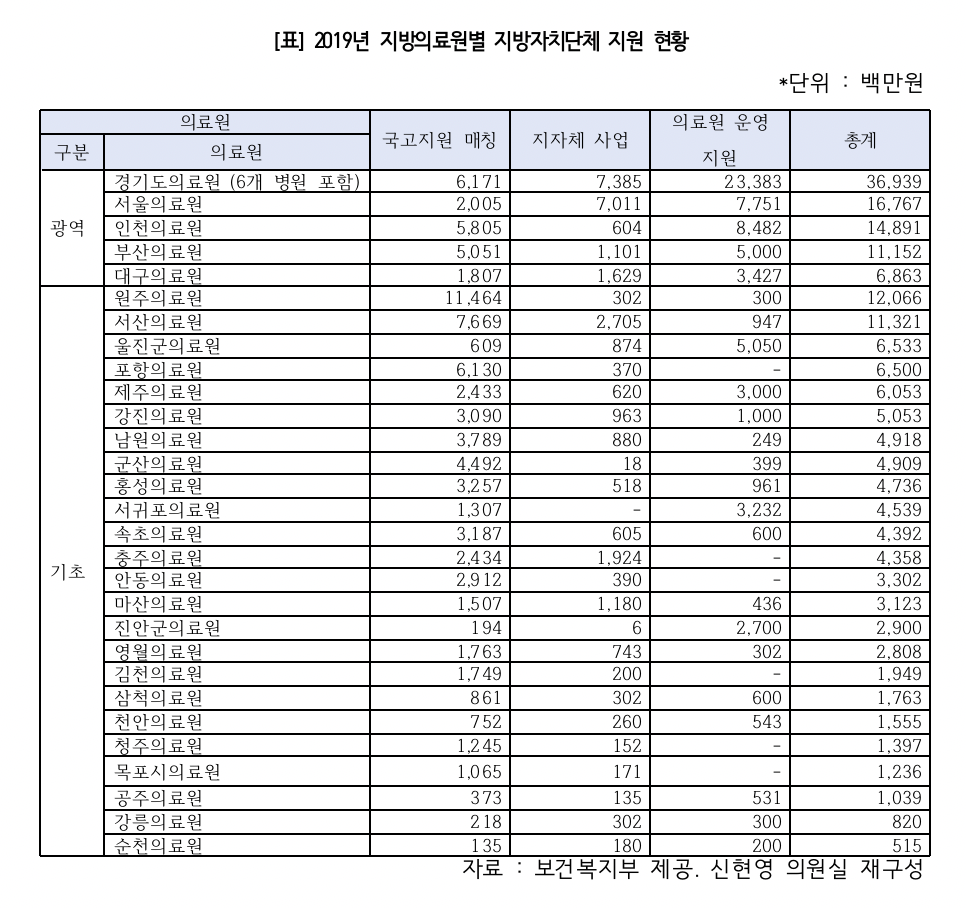 국회 보건복지위원회 소속 더불어민주당 신현영 의원이 보건복지부에서 제출받은 <2019년 지방의료원별 지방자치단체 예산 지원 현황>에 따르면 지방자치단체별로 지방의료원에 지원하는 예산이 천차만별이었다.