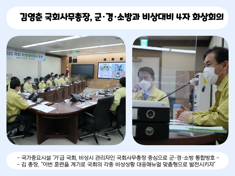 김영춘 사무총장은 10월 29일(화) 오전 2020년 국회 비상대비태세 훈련 상황보고를 주재하고 국회 통합방호 지원기관장인 군부대 대대장, 영등포경찰서장, 영등포소방서장과 4자 화상회의를 실시하였다.