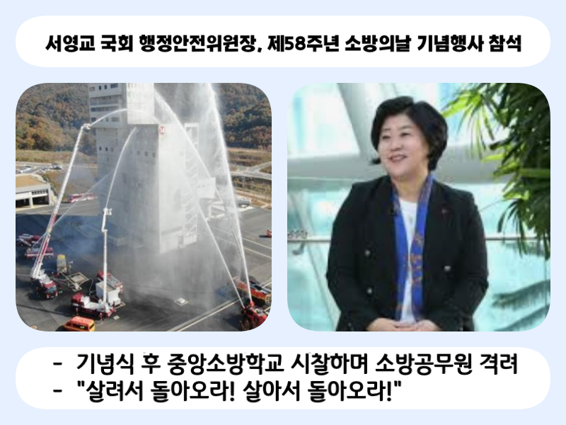 서영교 행안위원장은 “소방의 날에 중앙소방학교를 방문하게 되어 더욱 뜻깊다. 한국 소방의 모범적인 행정 시스템과 전국 어디서나 제공되는 구급 서비스의 선진화에 국회 행안위원장으로서 자부심을 느낀다”며 “국민의 안전을 위해 밤낮없이 뛰는 소방관들의 복지 향상과 적극행정 지원을 위해 힘쓰는 행안위원장이 되겠다”고 밝혔다.