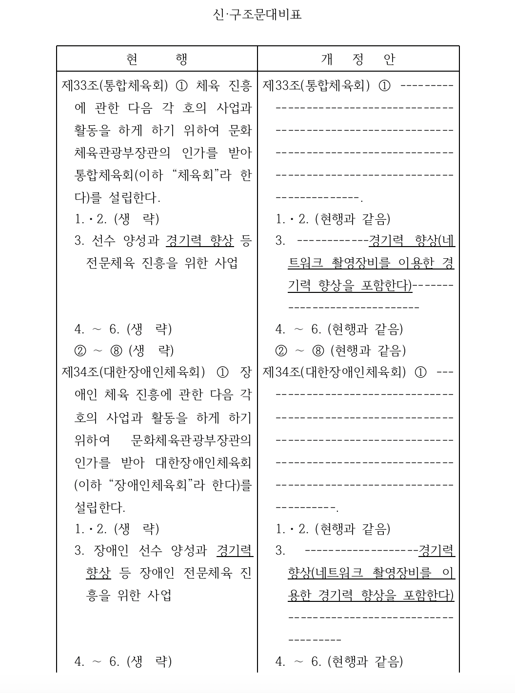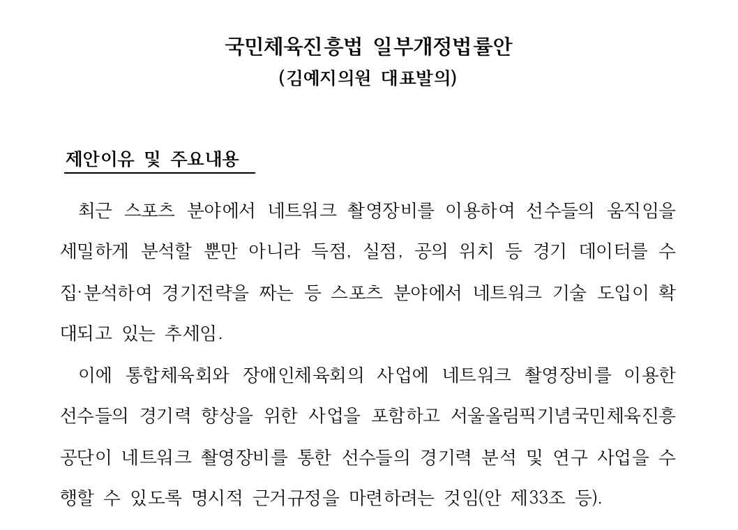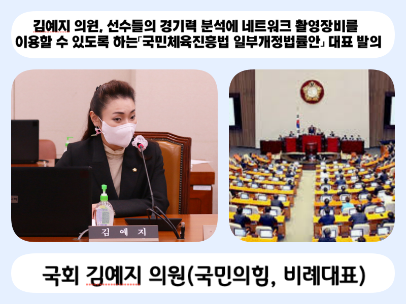 . 국회 김예지 의원(국민의힘, 비례대표)은 선수들의 경기력 분석에 네트워크 촬영장비를 이용할 수 있도록 하는 「국민체육진흥법 일부개정법률안」을 대표 발의했다.