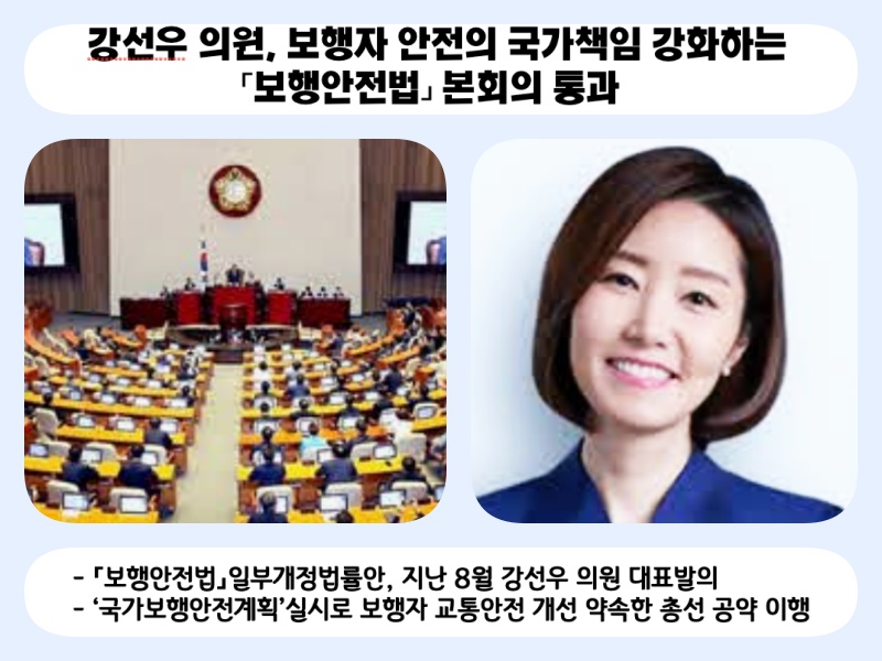 -「보행안전법」일부개정법률안, 지난 8월 강선우 의원 대표발의 - ‘국가보행안전계획’실시로 보행자 교통안전 개선 약속한 총선 공약 이행 |