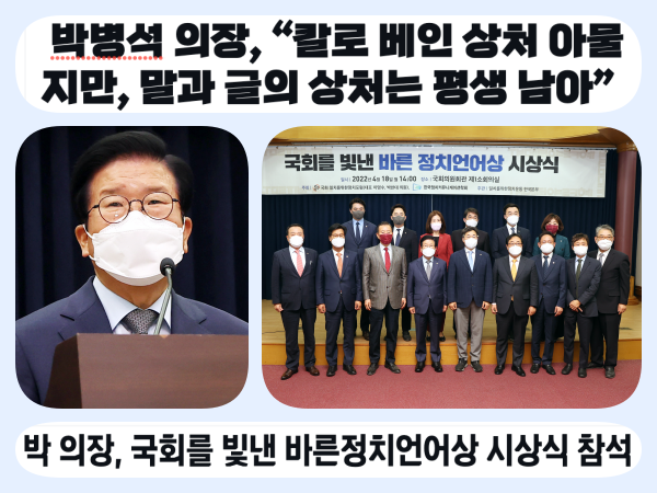 박병석 국회의장 축사를 통해 ‘국회를 빛낸 바른정치언어상 시상식’에 참석해 “칼로 베인 상처는 아물 수 있지만, 말과 글로 벤 상처는 아물지 않을 수 있다”고 강조했다.