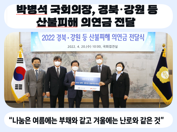 국회접견실에서 열린 의연금 전달식에서 박 의장은 “나눔은 여름에는 부채와 같고 겨울에는 난로와 같은 것”이라며 “환난구휼이라는 우리의 따뜻한 전통이 있는데, 국회의 작은 모금이 이재민의 재기에 도움과 응원이 됐으면 좋겠다”고 말했다.