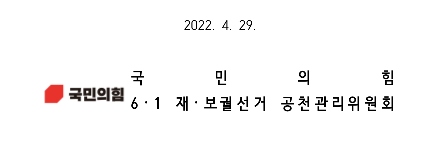 국민의힘 6・1 재・보궐선거 공천관리위원회(위원장 : 윤상현 국회의원)는 금일(4.29.) 제1차 회의를 개최하여, 6・1 재보궐선거 공고・공모 일정 등을 다음과 같이 의결했다.