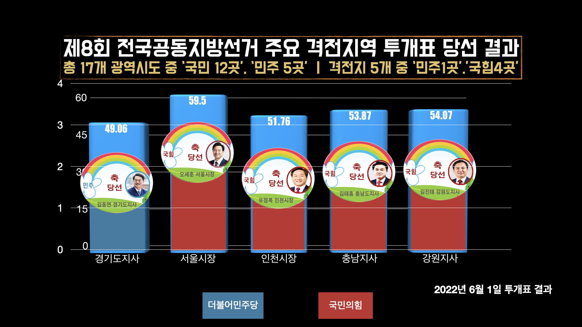 제8회전국공동지방자치 투·개표 결과 "국민의힘 압승" 17개 광역시도 중 5곳의 격전지 4곳 국힘, 1곳 민주당 |