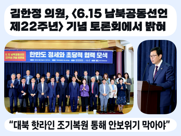 더불어민주당 김한정 국회의원(국회 정무위원회, 예산결산특별위원회)이 공동대표를 맡고 있는 <국회 한반도평화포럼>은 15일(수) 오전 10시, 국회의원회관 제1소회의실에서 ‘한반도 정세와 초당적 협력 모색’을 주제로 6.15 남북공동선언 제22주년 기념 토론회를 개최했다.