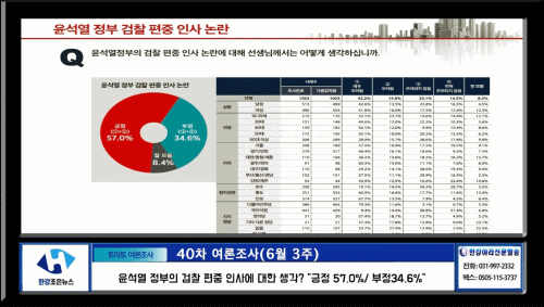 윤석열 정부 검찰 편중 인사에 대한 논란은 우려 -> 50.7%, 우려하지 않음-> 34.6% 으로 나타났다. 이런 현상은 지난 정부에서 여당 당시 민주당이 단독으로 '검찰 수사권 완전 박탈' 통과시킴에 따라 현 정부의 검찰 기능이 대폭 축소되었기 때문에 "대선 당시 공약으로 내 걸었던 현안들을 이행하기 위해 필요하다"는 말이 나오고 있다.