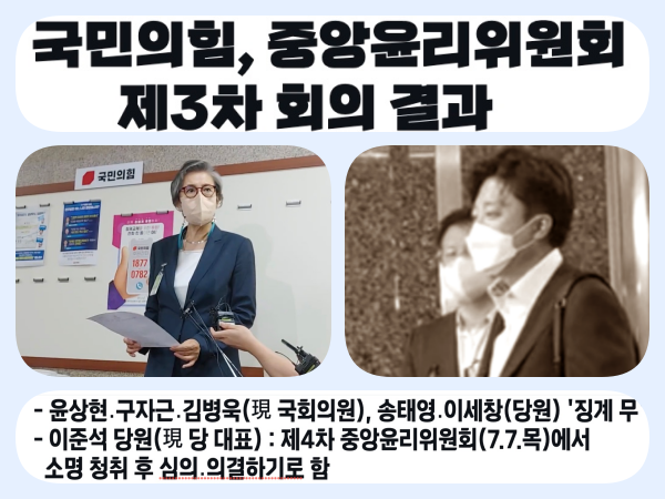 국민의힘, 중앙윤리위원회 제3차 회의 결과 발표 “제4차 윤리위(7월 7일)에서 소명 청취 후 심의·의결하기로...” |