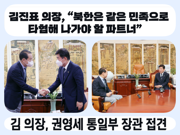 김진표 국회의장은 13일 오후 국회 의장집무실에서 권영세 통일부 장관을 접견하고 “북한은 우리와 같은 민족으로 대화와 타협해 나가야 할 파트너”라고 말했다.