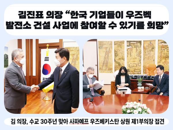 김 의장은 “양국은 그동안 대규모의 에너지·인프라 구축 사업을 성공적으로 추진해 왔다”며 “그 경험을 토대로 우리 기업들이 앞으로도 무바렉 화력발전소 현대화 사업 등 우즈벡이 추진하는 여러 사업에 참여할 수 있기를 희망한다”고 말했다.
