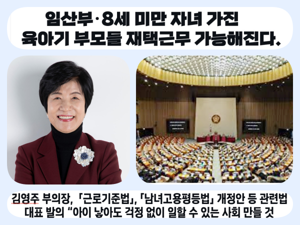 7월 25일 국회 김영주 의원(국회부의장, 더불어민주당, 서울 영등포갑)은 임산부와 만 8세 미만 자녀를 가진 노동자가 출산 준비와 육아를 위해 재택근무를 할 수 있도록 하는 내용의 「근로기준법」·「남녀고용평등과 일·가정 양립 지원에 관한 법률」 등의 개정법률안을 대표 발의했다.