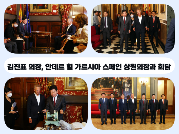 특히 김 의장은 “스페인은 유럽 내에서 우리 국민들이 가장 선호하는 국가로 코로나 이전에는 연간 50∼60만 명이 방문했다”면서 “최근엔 코로나로 중단됐던 서울-바르셀로나 직항 재개 및 노선 증설로 관광객이 다시 증가할 것으로 기대된다”고 말했다. 김 의장은 이어 “특히 스페인 젊은 층이 한국 대중문화 음식에 관심 많은 것으로 알고 있다”면서 “내년 서울 중심가에 ‘세르반테스 문화원’이 곧 개관한다는 반가운 소식을 들었는데 이를 통해 앞으로 문화교류가 더 확대될 것으로 기대한다”고 말했다.