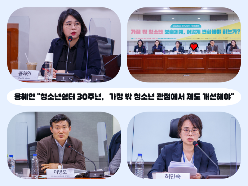 기본소득당 용혜인 의원이 11월 18일 오전 10시 국회의원회관 제8간담회실에서 <가정 밖 청소년 보호체계, 어떻게 변화해야 하는가> 토론회를 개최했다. 용혜인 의원은 “올해는 청소년쉼터가 만들어진지 30년 되는 해”라며, “가정 복귀와 시설 보호 중심의 가정 밖 청소년 보호체계가 가진 한계를 돌아볼 때”라고 밝혔다. 용 의원은 “11월 19일 아동학대 예방의날”이라며, “아동학대를 예방하기 위해서는 가정폭력을 경험하는 아동청소년에게 ‘집에서 견디라’고 말하지 않는 사회가 필요하다”고 강조했다.