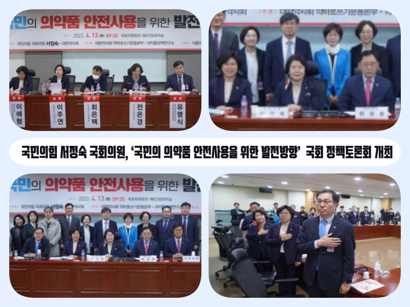 서정숙 국민의힘 국회의원이 대한약사회와 공동으로 주최하는「국회 정책토론회 - 국민의 의약품 안전사용을 위한 발전방향」가 4월 13일(목) 오전 9시 30분 국회의원회관 제8간담회의실에서 개최되었다.