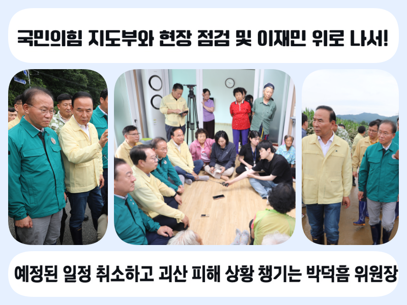 최근 사흘 간 괴산군에 400mm 넘는 비가 쏟아지며 피해가 잇따르자, 국회 정보위원장인 박덕흠 의원(보은‧옥천‧영동‧괴산군, 국민의힘)은 16일 국민의힘 지도부와 함께 수해 상황을 살펴보고 긴급 대피한 주민들을 위로하고 나섰다.