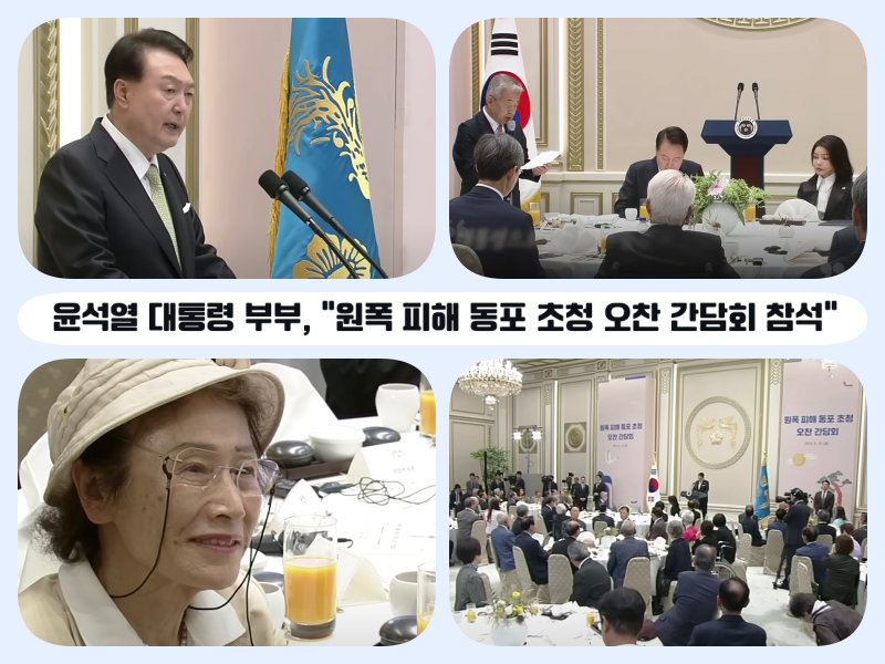 윤석열 대통령 부부는 추석날이자 6일 간의 추석 연휴 둘째 날인 오늘(9. 29, 금) 오후, 청와대 영빈관에서 열린 원폭 피해 동포 초청 오찬 간담회에 참석했습니다. 대통령이 동포들과 악수를 나누며 들어서자 동포들은 일어서서 큰 박수로 맞이했습니다.
