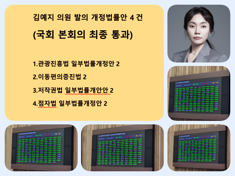 한편 국민의힘 비상대책위원이자 문화체육관광위원회 위원인 김예지 의원은 현재까지 169건의 법안과 1건의 결의안을 대표 발의했으며, 2월 1일 국회를 통과한 4건의 법안을 포함하면 총 42건의 법안과 1건의 결의안이 국회 본회의를 최종 통과하는 성과를 거두었다.
