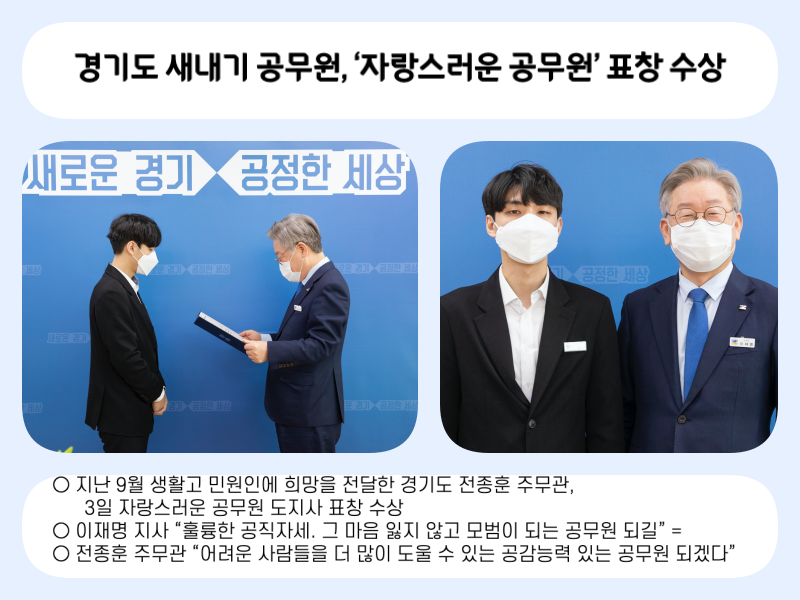 ○ 지난 9월 생활고 민원인에 희망을 전달한 경기도 전종훈 주무관, 3일 자랑스러운 공무원 도지사 표창 수상 ○ 이재명 지사 “훌륭한 공직자세. 그 마음 잃지 않고 모범이 되는 공무원 되길” ○ 전종훈 주무관 “어려운 사람들을 더 많이 도울 수 있는 공감능력 있는 공무원 되겠다” |