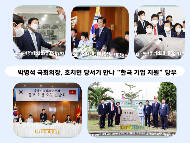 이에 앞서 오전 박 의장은 동나이성에 있는 삼일비나 제2공장을 방문했다. 기념 식수를 마친 박 의장은 “베트남 국민의 신뢰를 받는 기업이 되어 달라”고 당부하고 현지 직원들을 격려했다. 이어 효성 현지공장을 방문해 “한국 경제는 물론 베트남에도 도움이 되는 기업이 되길 바란다”고 당부하고, “양국 경협에 효성이 크게 기여했다는 것을 베트남 시민들도 기억할 것”이라고 강조했다.