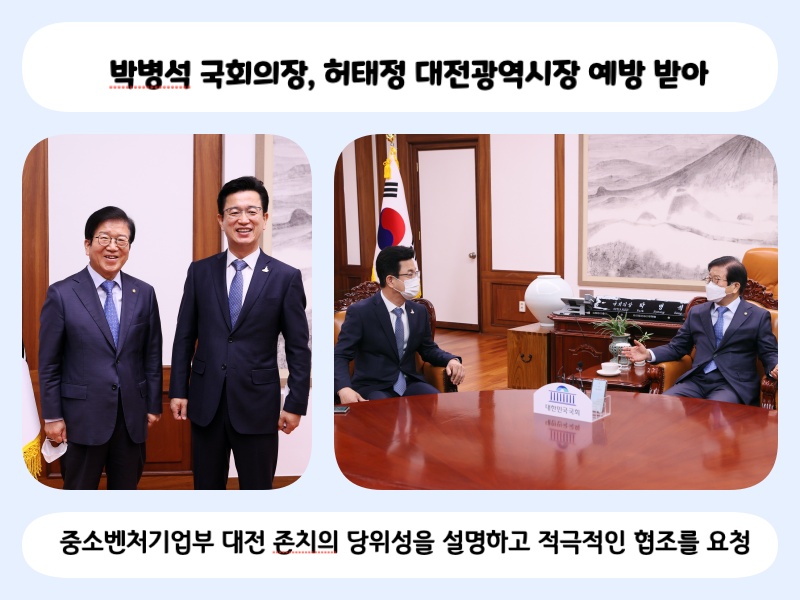 허태정 대전시장은 지역 출신의 박병석 국회의장을 면담하고 중소벤처기업부 대전 존치의 당위성을 설명하고 적극적인 협조를 요청했다.