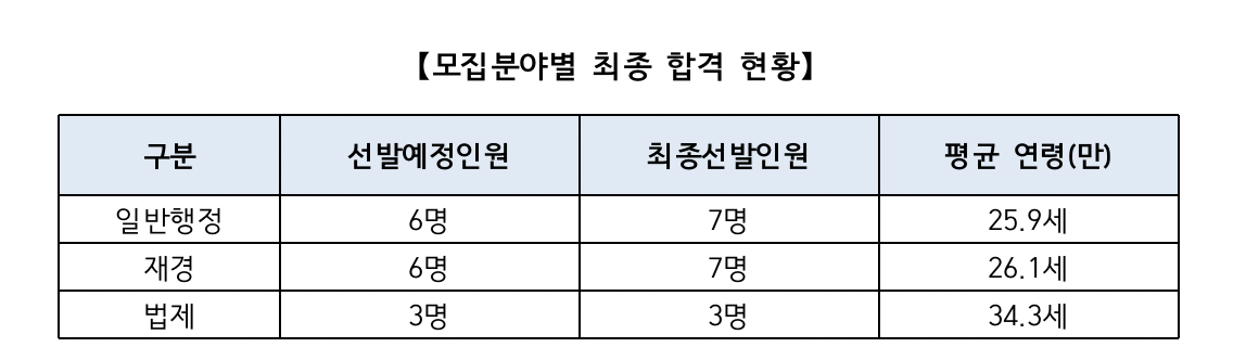 ▶ 선발예정인원 15명에 3,225명 지원, 215:1 경쟁률 기록 - ▶ 지방인재 채용목표제 적용으로 추가합격자 2명 포함 일반행정직 7명, 재경직 7명, 법제직 3명 최종 합격 |