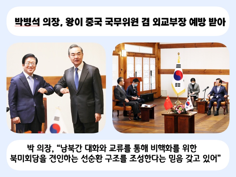 이날 예방은 30분 동안 진행될 예정이었으나, 박 의장과 왕 위원이 양국의 여러 현안을 논의하면서 1시간가량 진행됐다.