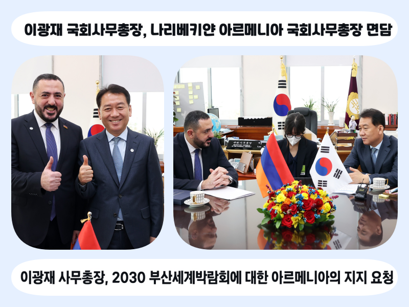 - 이광재 사무총장, “수교 30주년 뜻깊은 해 한국 방문 환영” - - 나리베키얀 사무총장, “한국은 아르메니아의 주요 파트너, 협력 가능성과 잠재력 풍부” - - 이광재 사무총장, 2030 부산세계박람회에 대한 아르메니아의 지지 요청 - |