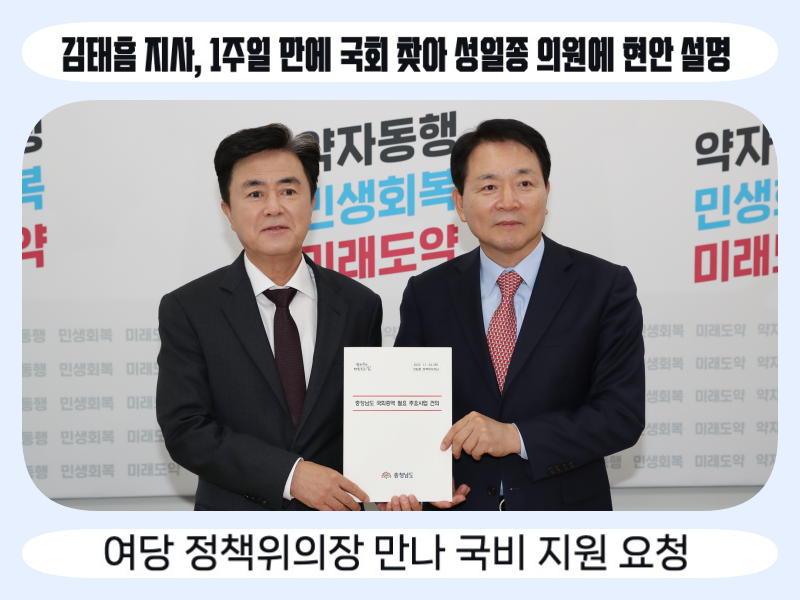 내년 정부예산안에 대한 국회 심의가 막바지에 이르고 있는 가운데, 김태흠 충남도지사가 지난 17일에 이어 1주일 만에 국회를 다시 찾았다.