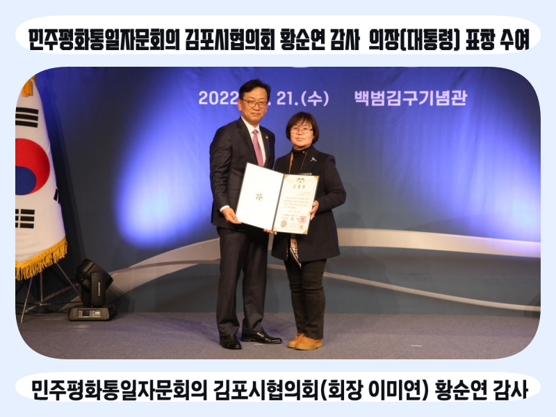 민주평화통일자문회의 김포시협의회(회장 이미연) 황순연 감사는 2022년도 지역사회에서 평화통일 공감대 확산 활동으로 평화와 번영의 한반도를 만들어가는데 기여한 공으로 12월 21일(수) 백범 김구기념관에서 민주평화통일자문회의 의장(대통령)표창 수상의 영예를 안았다.