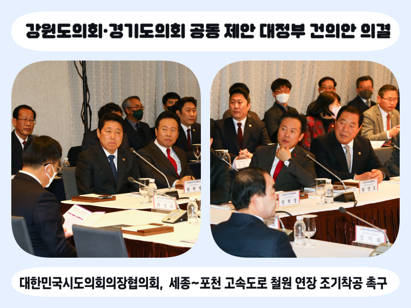 강원도의회(의장 권혁열)는 1월 26일 울산에서 개최된 대한민국시도의회의장협의회 2023년 제1차 임시회에서 강원도의회와 경기도의회가 공동으로 제안한 “세종~포천 고속도로 철원 연장 조기착공 촉구 건의안”이 의결되었다고 밝혔다.