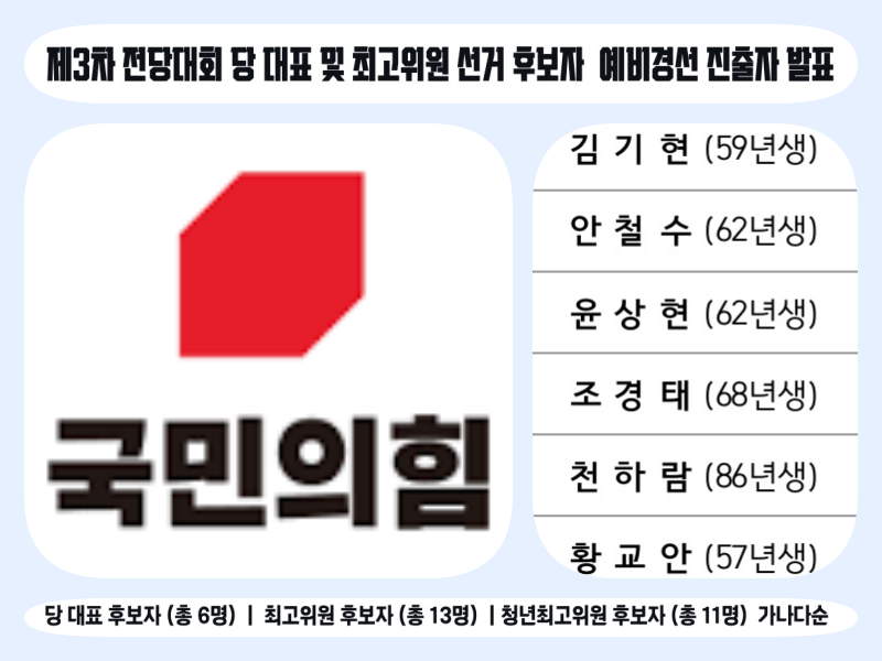 국민의힘 제3차 전당대회 당 대표 및 최고위원 선출을 위한 중앙당 선거관리위원회(위원장 : 유흥수)는 금일(2.5.) 후보신청자를 대상으로 자격심사를 실시하여 예비경선 진출자를 아래와 같이 결정했다. (명단 순서는 성명의 가나다順)