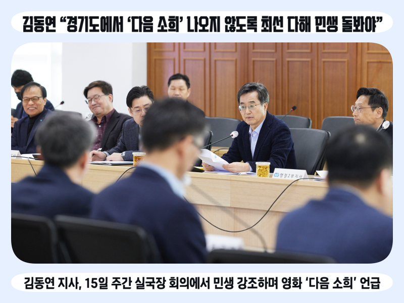 ○ 김동연 지사, 15일 주간 실국장 회의에서 민생 강조하며 영화 ‘다음 소희’ 언급 - “넥스트 소희가 경기도에서 한 명도 나오지 않도록 한다는 마음으로 최선 다해 민생 돌보면 좋겠다” 강조 ○ “난방비 문제는 취약계층만의 문제 아냐,” 중앙정부에 폭넓은 지원 촉구 |