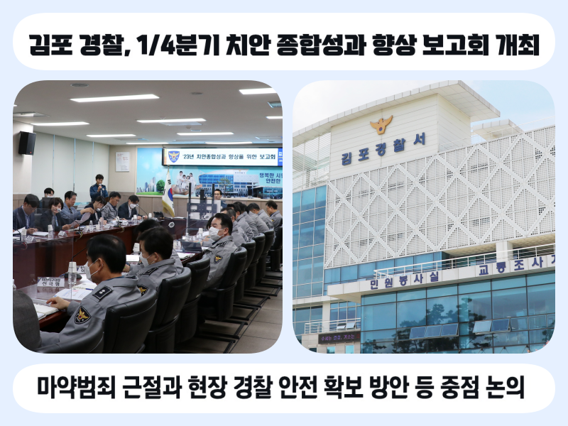 김포경찰서(서장 김규행)는 ’23. 4. 26.(수) 오전, 김포경찰서(3층 중회의실)에서 경찰서 과·계·팀장과 전 지역경찰관서장들이 참석한 가운데「김포 경찰 1/4분기 치안 종합성과 향상 보고회」를 개최하였다.