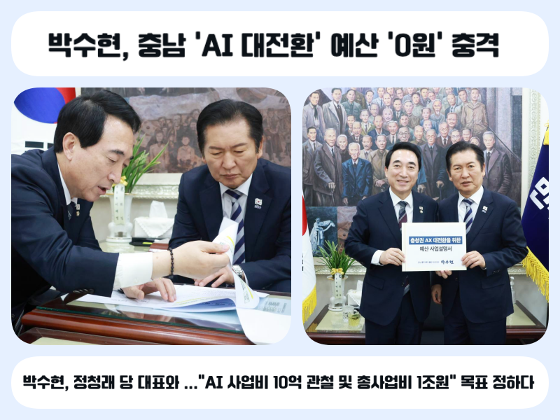 충남‘AI 대전환’ 예산 '0원' 충격... 박수현 "정청래 대표와 AI 사업기획비 10억 관철시킬 것" <총사업비 1조원 목표> |
