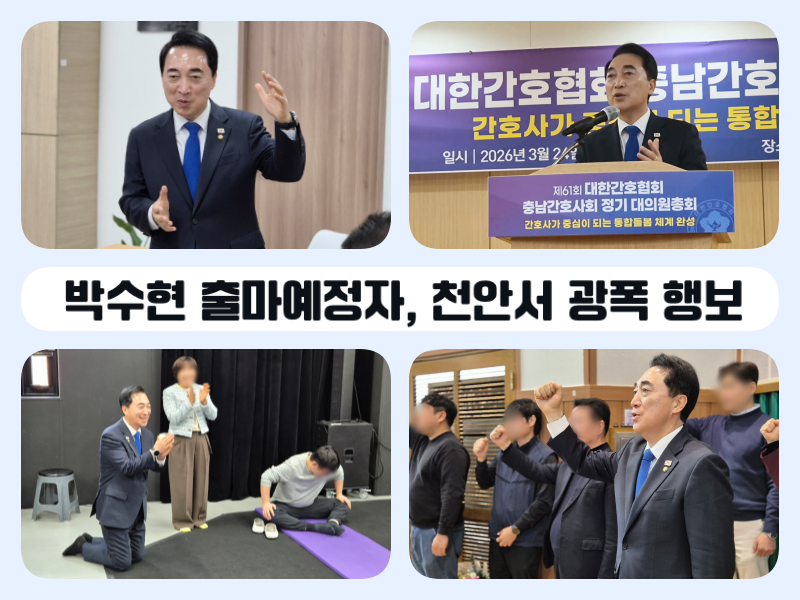 충남간호사협회 대의원총회에서 박수현 출마예정자는 “해외 선진국은 간호사 1명이 4~5명을 책임지는데, 우리 간호사님들은 1분당 16명에 달하는 환자분들을 책임지고 있다”며 “특히 충남과 같은 의료취약지에서는 그 범위가 더욱 크다. 간호사 여러분의 처우 개선은 미룰 수 없는 과제”라고 말했다. 이어 “격차가 현장의 고통으로 이어지지 않도록, 진료 지원 간호사 양성, 적정 환자 수 제도화 등의 과제를 해결하기 위해 함께하겠다”고 밝혔다.