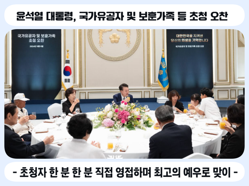 윤석열 대통령은 오늘(6. 6, 목) 청와대 영빈관에서 제69회 현충일을 맞아 국가유공자 및 보훈가족 등 160여 명을 초청해 오찬을 함께했습니다.