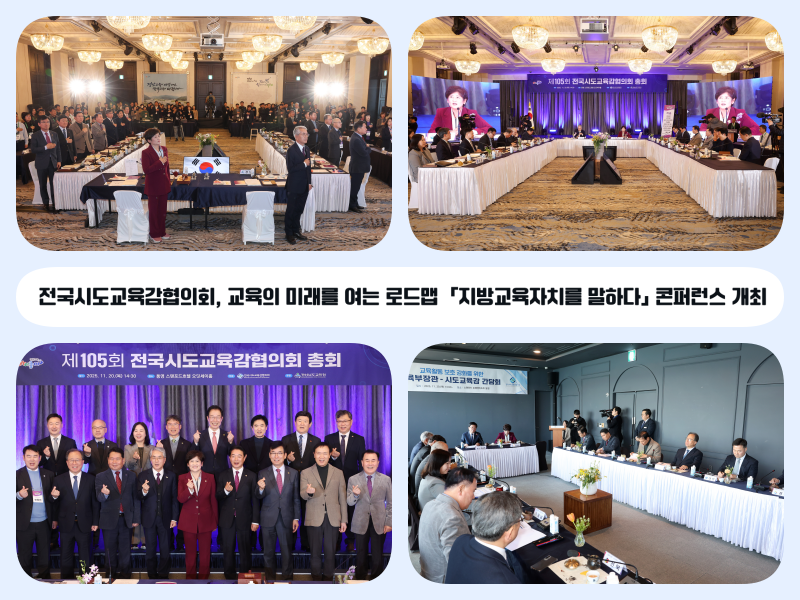 ▶ 경남 통영에서 제105회 전국시도교육감협의회 총회 개최 ▶ 「학부모 교육참여 법제화 건의」 등 8건 심의․의결 ▶ 「대학수학능력시험 부정행위 현황」, 「고등·평생교육지원특별회계 도입·연장 대응 경과」 교육의제 토의 ▶ 교육부장관-시도교육감 교육활동 보호를 위한 간담회 열어 |