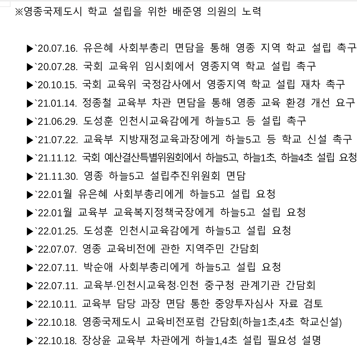 한편 배준영 의원은 임기 중 운서 중학교, 운남 고등학교, 윤슬 초등학교, 달빛 초등학교, 영종 특수학교, 미단 초중통합학교, 하늘2 초등학교, 하늘5 중학교 등 8개 학교 신설을 확정지었다.