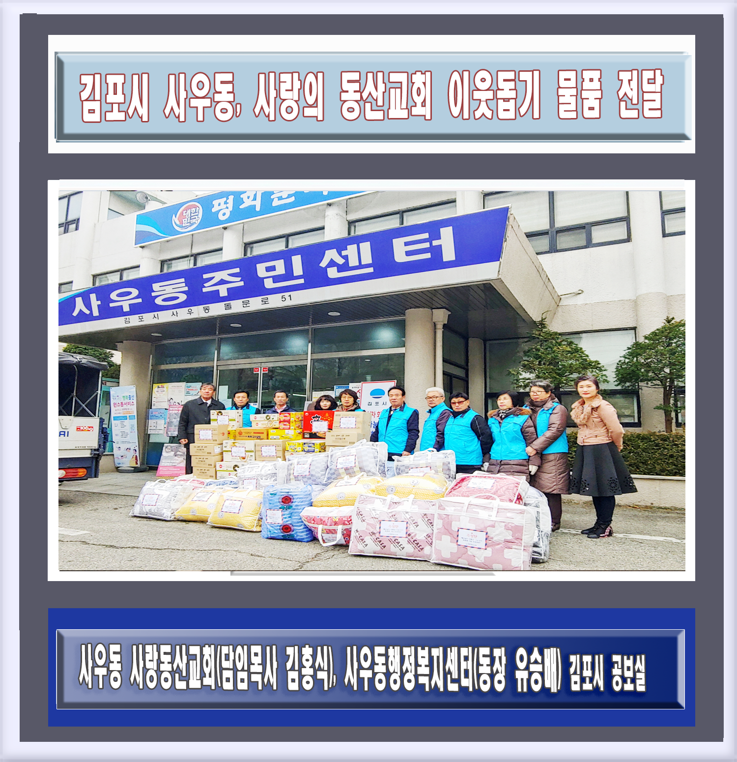사우동 사랑의 동산교회(담임목사 김홍식)는 지난 11일, 관내 저소득층을 위해 컵반, 라면, 이불 등 이웃돕기 물품을 사우동행정복지센터(동장 유승배)에 전달했다.