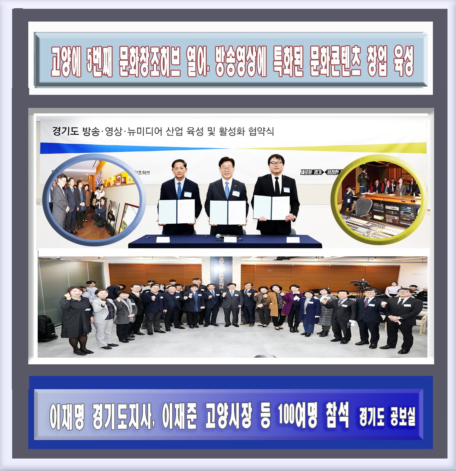 한편, 이재명 경기도지사는 이날 개소식장에서 이재준 고양시장, 고석원 카카오 부사장이 함께한 가운데 ‘경기도 방송‧영상‧뉴미디어 산업 육성 및 활성화 협약’을 체결했다.