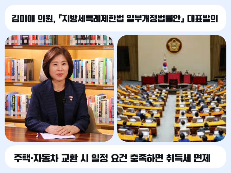 국민의힘 김미애 국회의원(부산 해운대을, 재선)은 4일 국민이 생활상의 필요로 주택이나 자동차를 교환하는 경우 취득세를 면제하도록 하는 「지방세특례제한법 일부개정법률안」을 대표 발의했다.