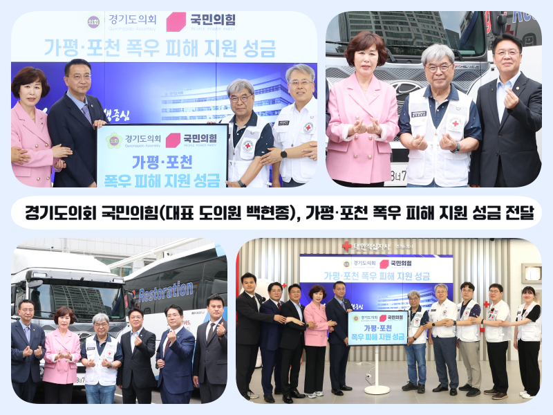 해당 성금은 지난 한 주간 국민의힘 소속 의원이 자발적으로 참여해 모은 금액으로 지난달 갑작스러운 폭우로 큰 피해를 입은 가평과 포천 지역 피해 주민들에게 전달될 예정이다. 이날 성금 전달식에는 백현종 대표의원을 비롯해 이석균 기획수석, 이채영 정책수석, 김현석 청년수석, 유형진 교육수석 등 국민의힘 대표단과 함께 이재정 대한적십자사 경기도지사회장, 우광호 사무처장이 참석했다.