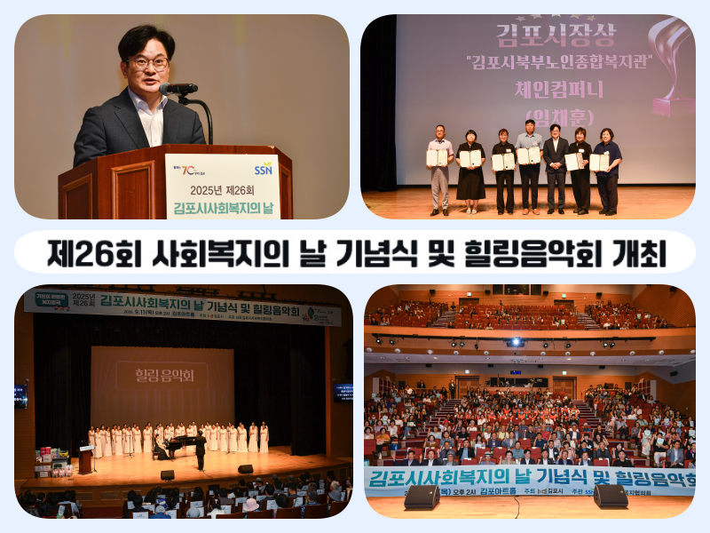 김포시사회복지협의회(회장 박기원)는 지난 9월 11일(목) 김포아트홀에서 ‘제26회 사회복지의 날 기념식 및 힐링음악회’를 성황리에 개최했다. 이번 행사는 사회복지에 대한 인식을 제고하고, 종사자들의 노고에 감사를 전하기 위해 마련됐으며, 사회복지 종사자와 시민, 관계자 등 400여 명이 참석해 자리를 빛냈다.