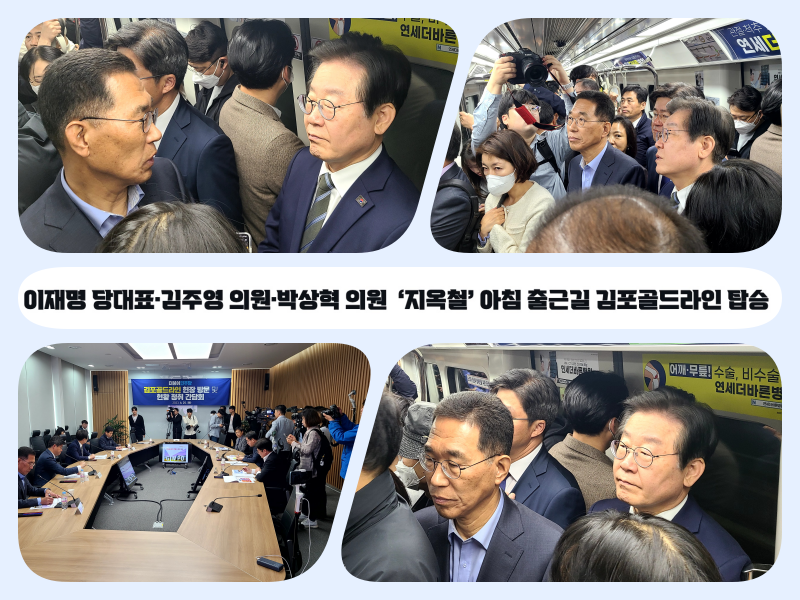 이재명 더불어민주당 대표와 국회 기획재정위원회 소속 김주영 의원(더불어민주당, 김포시갑)이 함께 김포시민들의 출근 지옥철을 경험하고 대책을 논의하고자 25일 오전 8시 30분 운양역에서 김포공항역까지 김포골드라인에 탑승했다.