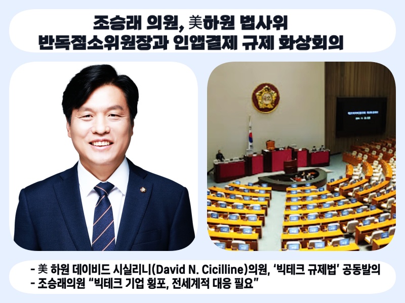 더불어민주당 조승래 국회의원 (대전유성구갑, 과학기술정보방송통신위원회 여당 간사)이 17일 밤 데이비드 시실리니 미국 하원 법사위원회 반독점소위원장(로드아일랜드주, 민주당)과 인앱결제 및 빅테크 기업의 규제방향 관련 화상회의를 가졌다.