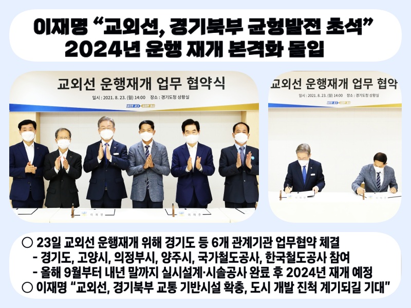 ○ 23일 교외선 운행재개 위해 경기도 등 6개 관계기관 업무협약 체결 - 경기도, 고양시, 의정부시, 양주시, 국가철도공사, 한국철도공사 참여 - 올해 9월부터 내년 말까지 실시설계·시솔공사 완료 후 2024년 재개 예정 ○ 이재명 “교외선, 경기북부 교통 기반시설 확충, 도시 개발 진척 계기되길 기대” |